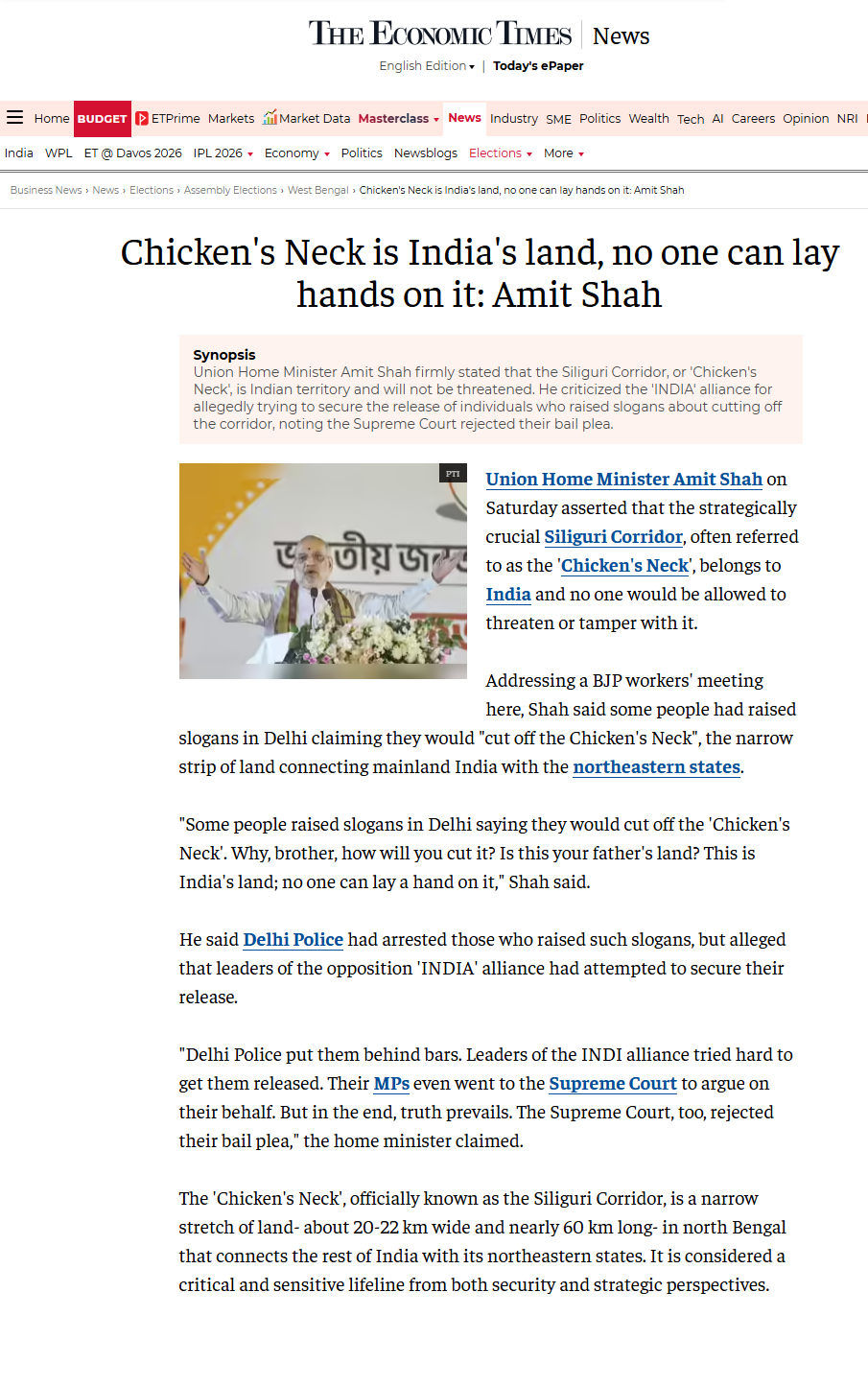 Chicken's Neck is India's land, no one c...